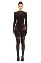 Tight high neck body made of extra soft eco-performance fabric that hugs the body and gives the feeling of a second skin. Contrasting sheer mesh and opaque panels create a beautiful complex design. Closes with small golden body snaps.