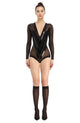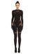 Full body catsuit made of extra soft eco-performance fabric that gives the feeling of a second skin. Opaque and sheer panels, open back with gold clasps at neck and mid-back. Arms turn into gloves with sheer fingers, with a slit on the forearm for freeing the hands. Legs extends into a fully fashioned foot.