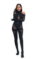 A suspender suit with opaque strips and mesh inserts. Opaque cups in the front, a halter top neck and a wide panel running down the middle of the back to emphasize its beautiful features. The suit continues as suspender tights that are open in both front and the back. Mesh diamonds run down the thigh in the front and the back, a full fashioned food and an elegant seam in the back.