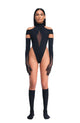 A high waisted thong with mesh triangles in the front and the back. A very high cut on the sides to show off the side of the legs and makes them look longer. Finished with a wide waistband and a cotton lining in the crotch for extra comfort. Super soft fabric moulds to the body and feels like a second skin.
