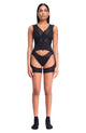 A supportive bustier bra without underwires. Vegan leather cups and panels form an elegant shape in the front.