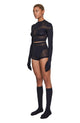 80 cm long fringe top, hand dyed ombre dyed from black to ocher. The fringe is attached to satin elastic and detailed with gold rings. Underneath are adjustable satin elastic straps with 24k gold slides that cross around the body.