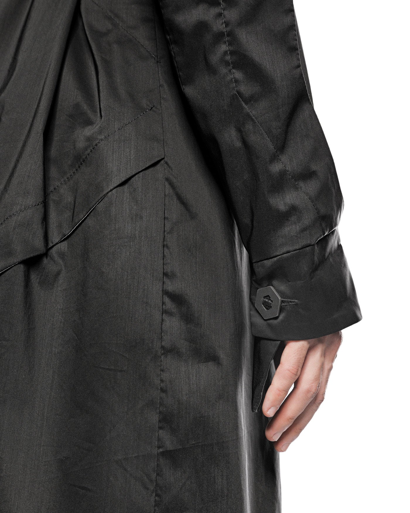 – Asymmetrical cuffs with signature steel hexagon buttons